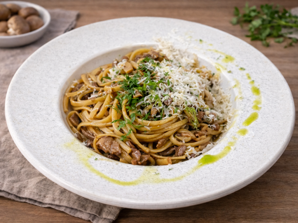 beef, spaghetti, parmesan, white onion, mushroom, garlic, olive oil, italian parsley