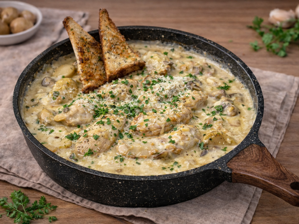 chicken, potato, mushroom, creamy garlic, onion, parsley, parmesan, garlic toast