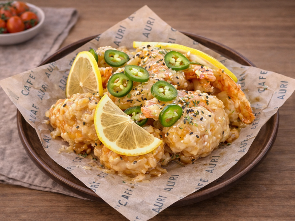 fried shrimp, jalapeno, lemon, condensed mayo, black sesame