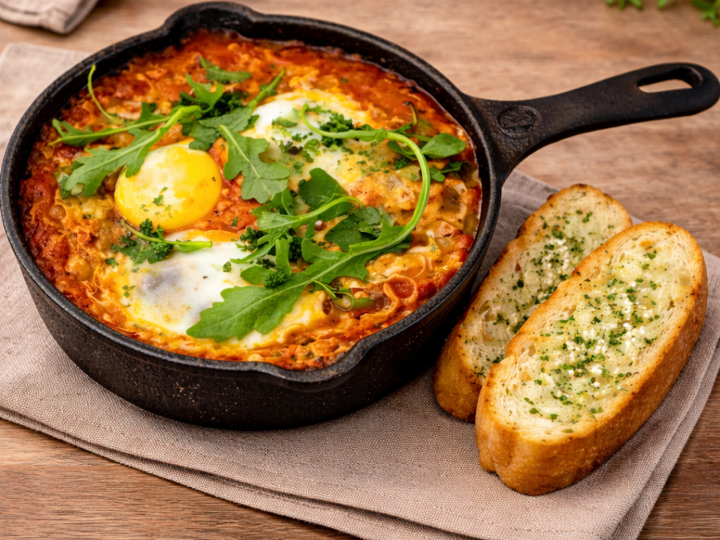 pomodoro, egg, mushrooms, arugula, garlic toast