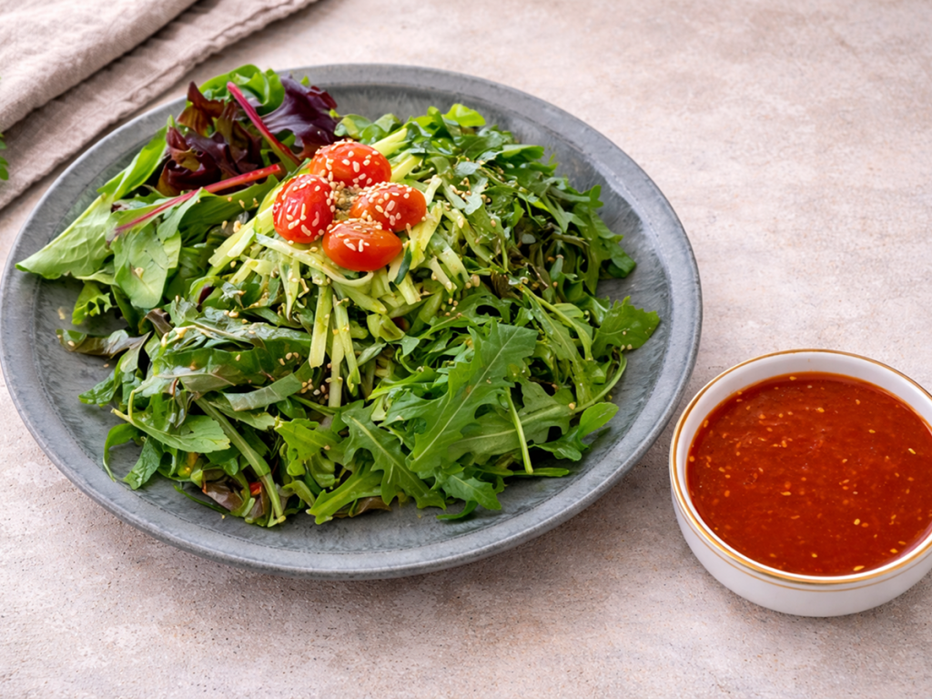 soba, spring mix, arugula, perilla leavese, cucumber, cherry tomato, sesame seeds, sesame oil, homemade sweet and sour spicy sauce