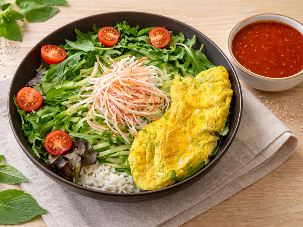 eggs, spring mix, arugula, perilla leaves, rice, cucumber, cherry tomato, immitation crab