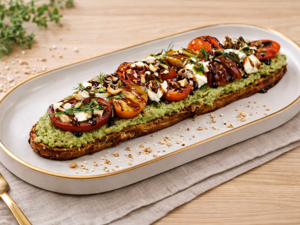 sourdough, avocado, cherry tomato, mozzarella, basil, dill, olive, almond, pistachio, olive oil, lemon zest, salt, pepper, balsamic drizzle