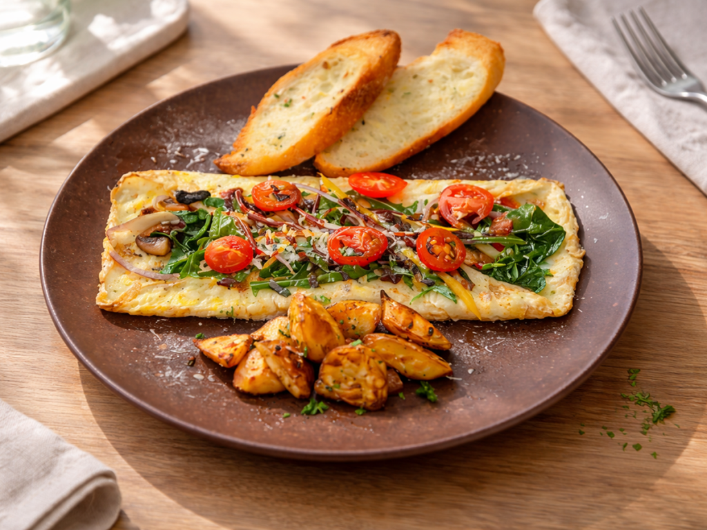egg, mushroom, onion, spinach, bell pepper, cherry tomato, arugula, parmesan, balsamic glaze, potato, garlic toast