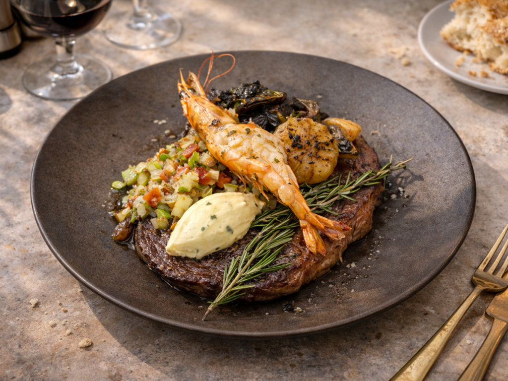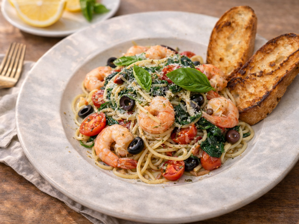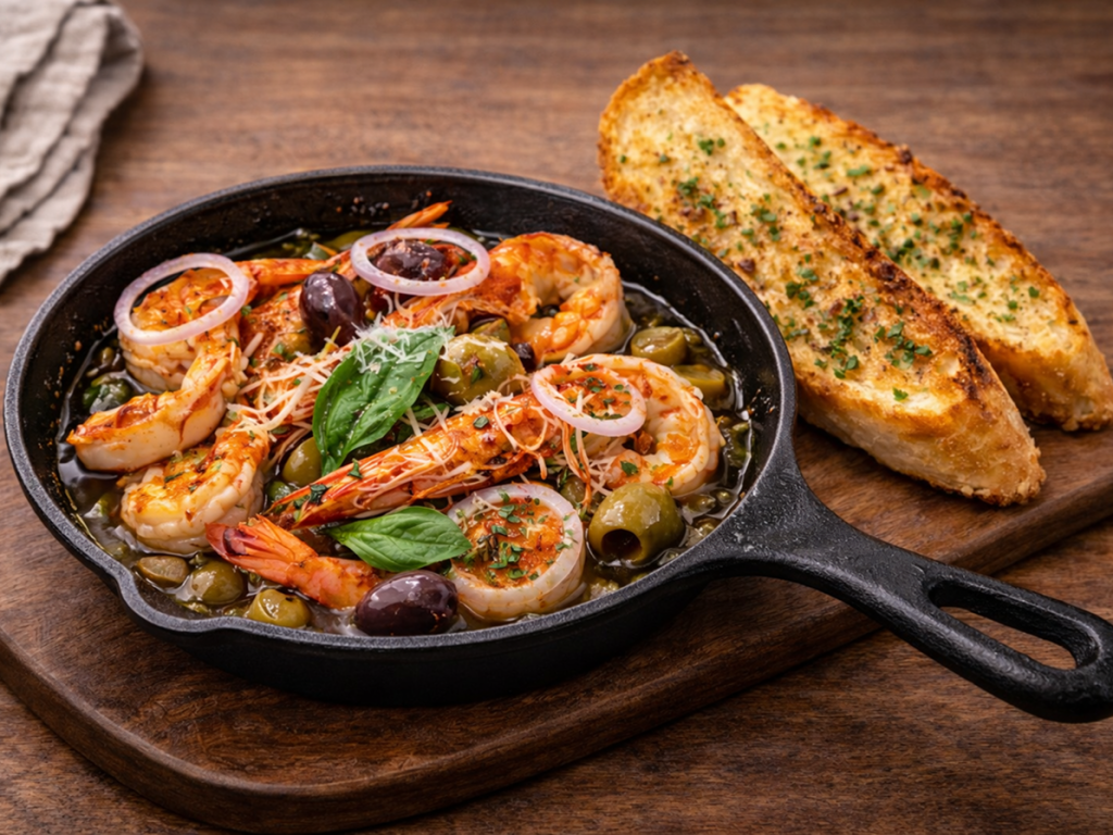 shrimp, olives, onion, garlic, parsley, basil, olive oil, garlic toast