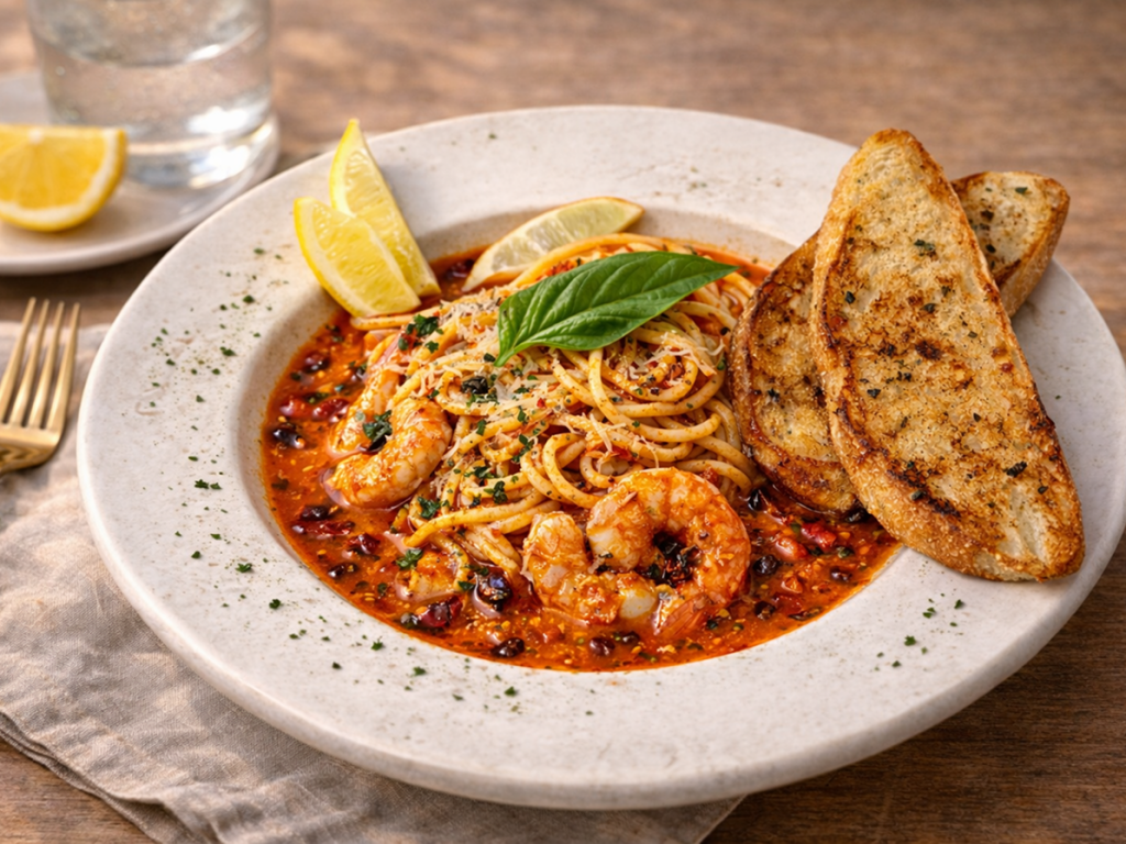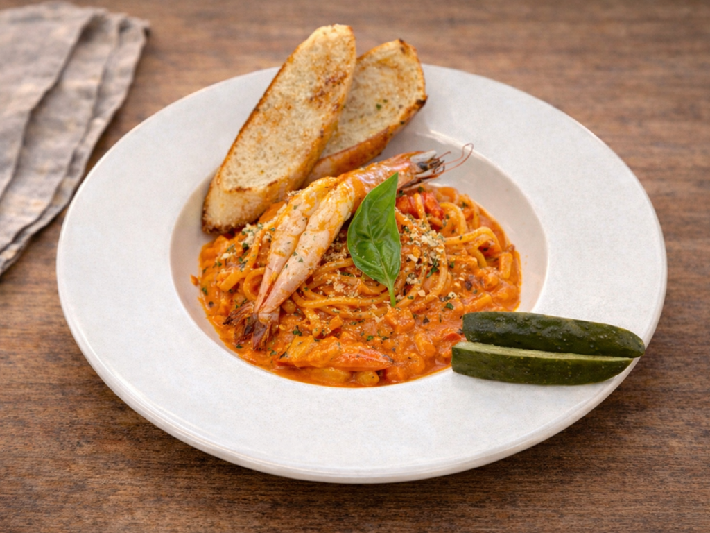 shrimp, creamy rose, spaghetti, garlic toast, basil, parmesan, pickle
