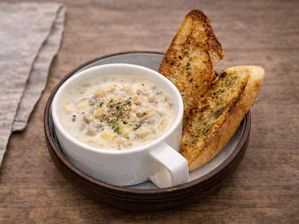 clam meat, potato, onion, garlic, clam stock, clam broth, cream, milk