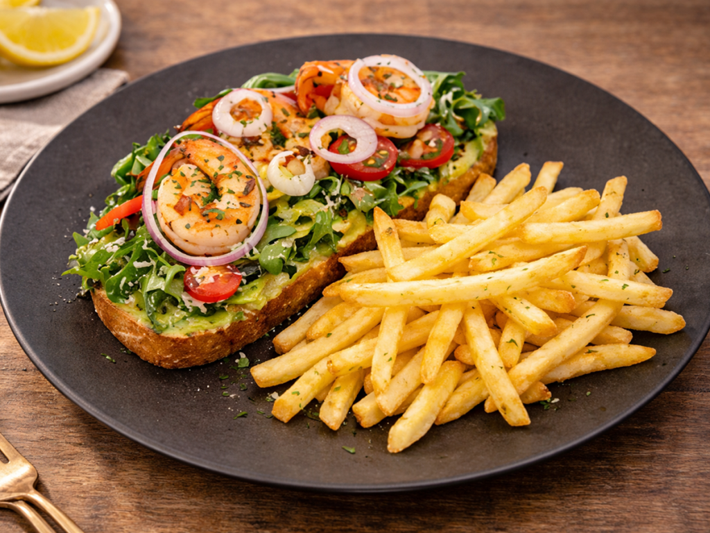 scrambled eggs, avocado, tomato, garlic toast